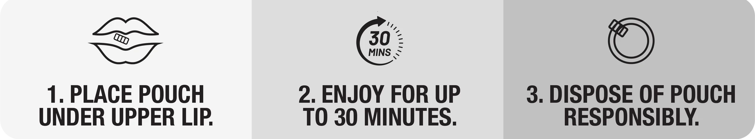 These pouches come in a Slim format at -29mm wide and -12mm tall. This allows for a discreet yet comfortable experience when placed under the lip. A unique wet & dry pouch production ensures that users receive both instant and long-lasting satisfaction for up to 30 minutes.